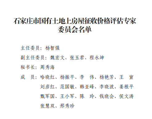 我公司副董事长兼总经理杨智强获选石家庄市国有土地上房屋征收价格评估专家委员会主任委员。我公司副总经理杨振平、征收部经理李伟获选评估专家委员会成员。